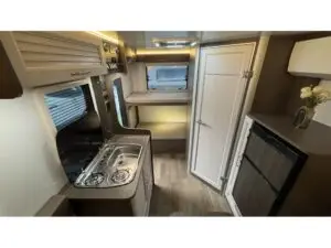 Mini-combinado, com tampa de vidro, em aço inox com fogão de 02 bocas e pia com cuba.